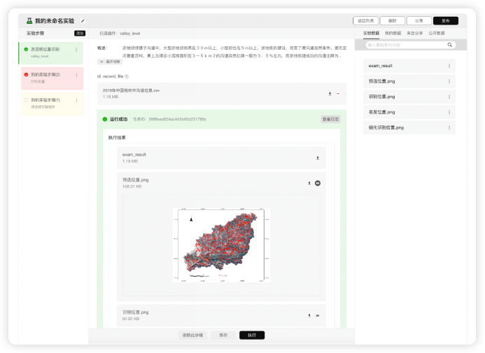 实验模块是数据分析的“训练场”,数据分析师可在实验过程上传待分析的数据,根据分析目标创建实验步骤并自由选择系统内置的通用组件或定制化算法组件。数据通常会经历格式转换、合并或拆分、加工、分析等多个实验步骤,应用多个组件最终得到分析结果。DataLab将持久化存储实验过程数据,用户查看和下载,也方便选取再次执行中间步骤。