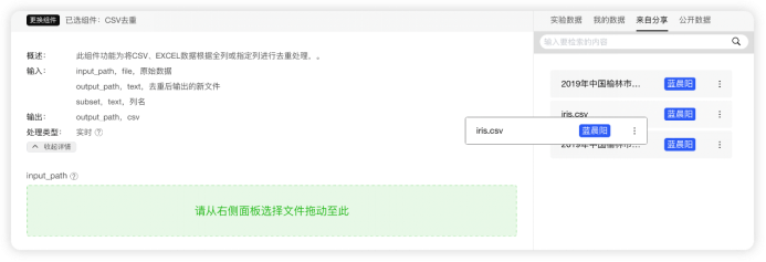 数据的选取是用户进行分析最常用的操作,DataLab支持将数据直接拖拽放入输入区,操作更加简便。