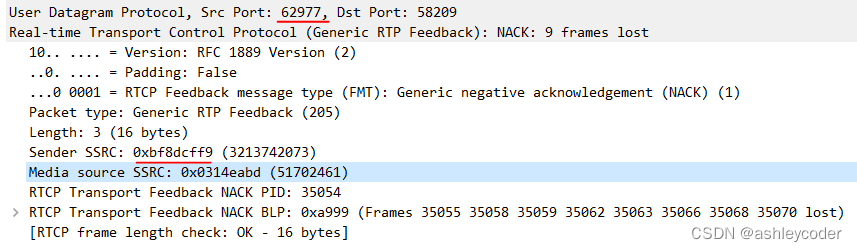 sender ssrc是发送RTCP NACK包这端发送视频rtp包的ssrc,media ssrc是随机生成的。?
