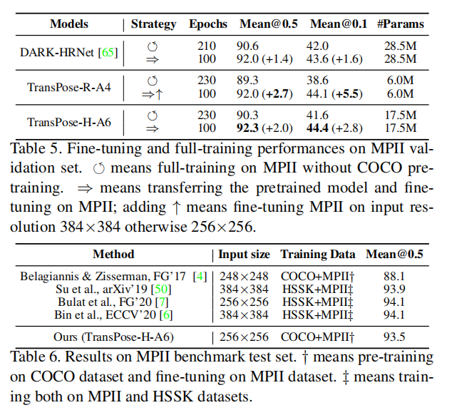 在常见的人体姿态估计体系结构中,通常采用32×降采样作为标准设置,以获得包含全局信息的非常低分辨率的地图。相比之下,本研究在ResNet-S和HRNet-S中采用了r = 8和r = 4设置,这有利于注意层的内存占用和详细信息的损失之间的权衡。因此,TransPose在更高的分辨率下直接捕获了远程交互,同时保留了细粒度的局部特征信息(但是这样参数不也多了吗?)。