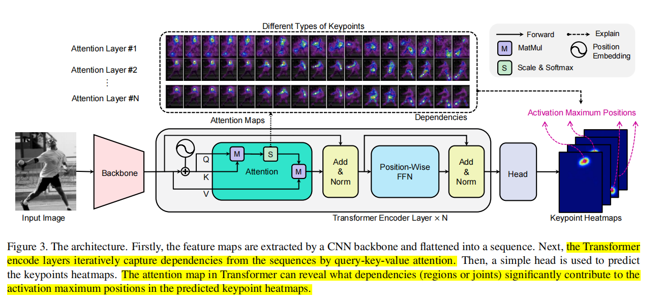 这项工作的目标是建立一个人体姿态估计器,它可以显式地捕获和揭示关键点之间的图像特定的空间依赖性,如上图所示。由于卷积的缩放特性较差,我们认为卷积在提取低级特征方面具有优势,但在高级特征上深度叠加卷积以扩大接受域并不能有效地捕获全局依赖关系。而这样的深度增加了解释CNN预测的难度。变压器架构在绘制成对或更高阶交互方面具有自然的优势。如图2所示,注意层使模型能够捕获任何成对位置之间的交互作用,其注意地图作为一个即时记忆来存储这些依赖关系。