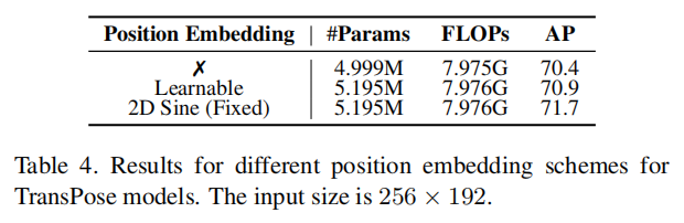 位置嵌入的重要性。在没有位置嵌入的情况下,二维空间结构信息丢失。为了探究其重要性,我们在TransPose-R-A3模型上进行了实验,实验中采用了三种位置嵌入策略:二维正弦位置嵌入、可学习位置嵌入和w/o位置嵌入。如预期的那样,具有位置嵌入的模型表现更好,特别是对于二维正弦位置嵌入。位置嵌入有助于更好地泛化看不见的输入分辨率
