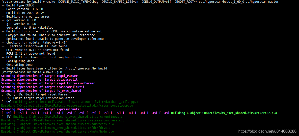 其中 BOOST_ROOT 是指定boost路径,DDEBUG_OUTPUT 是hyperscan的调试信息 on是打开,会有很多信息输出。