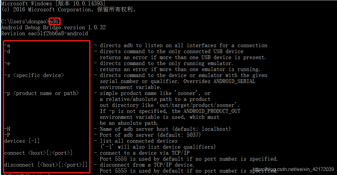 2、测试adb是否安装成功:在dos窗口的命令行工具输入adb会出来adb的一些命令就说明成功了。如下图