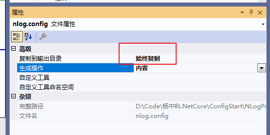 并设置该文件为始终复制,确保改动配置文件实时生效。