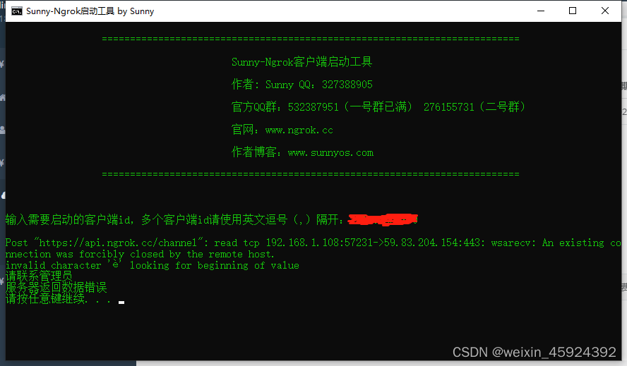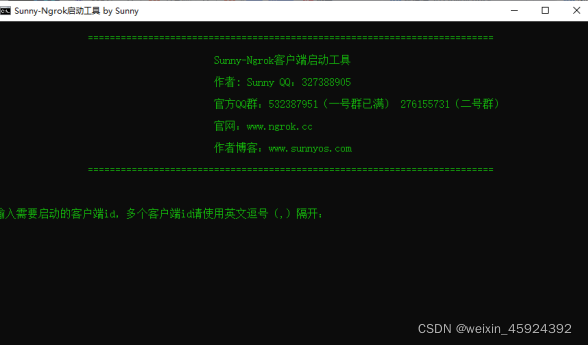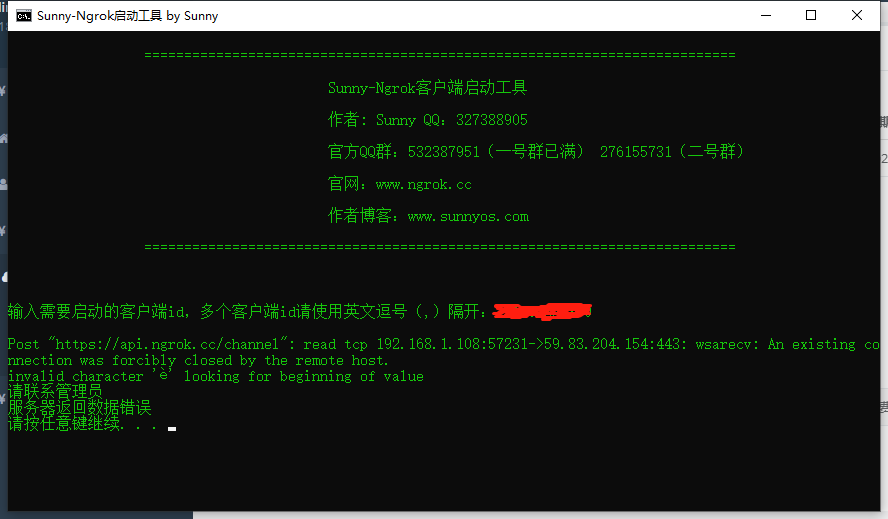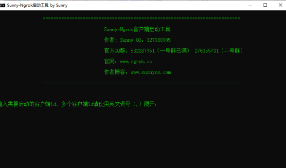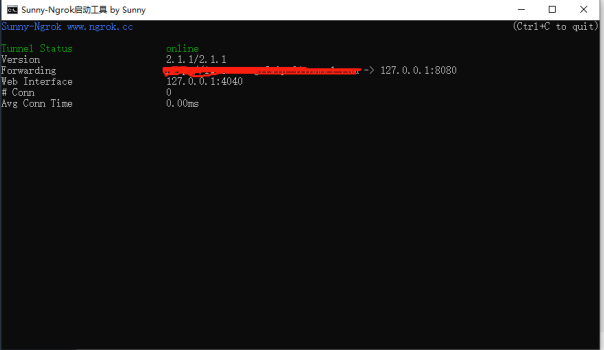 点击隧道列表中的客户端下载,选择对应的win/linux版本,解压,打开,点击Sunny-Ngrok启动工具,会出现一个弹窗页面,输入隧道id,即可实现连接,连接成功会出现以下online表示即为成功。