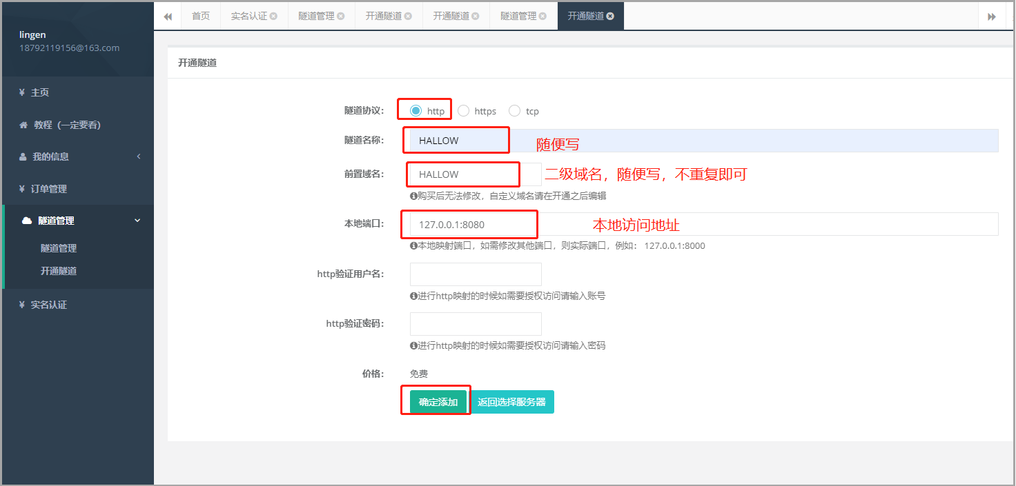 然后点击开通隧道,可以选择免费版本(虽然不太稳定)