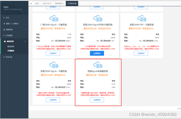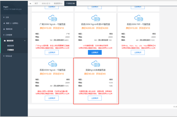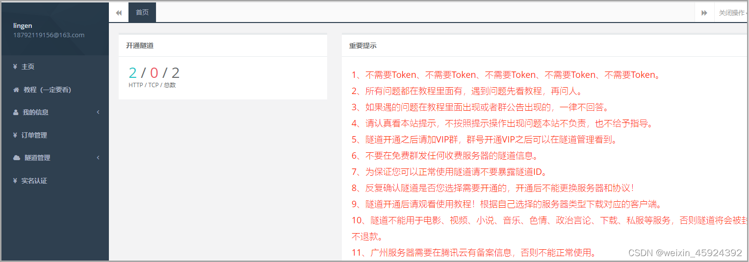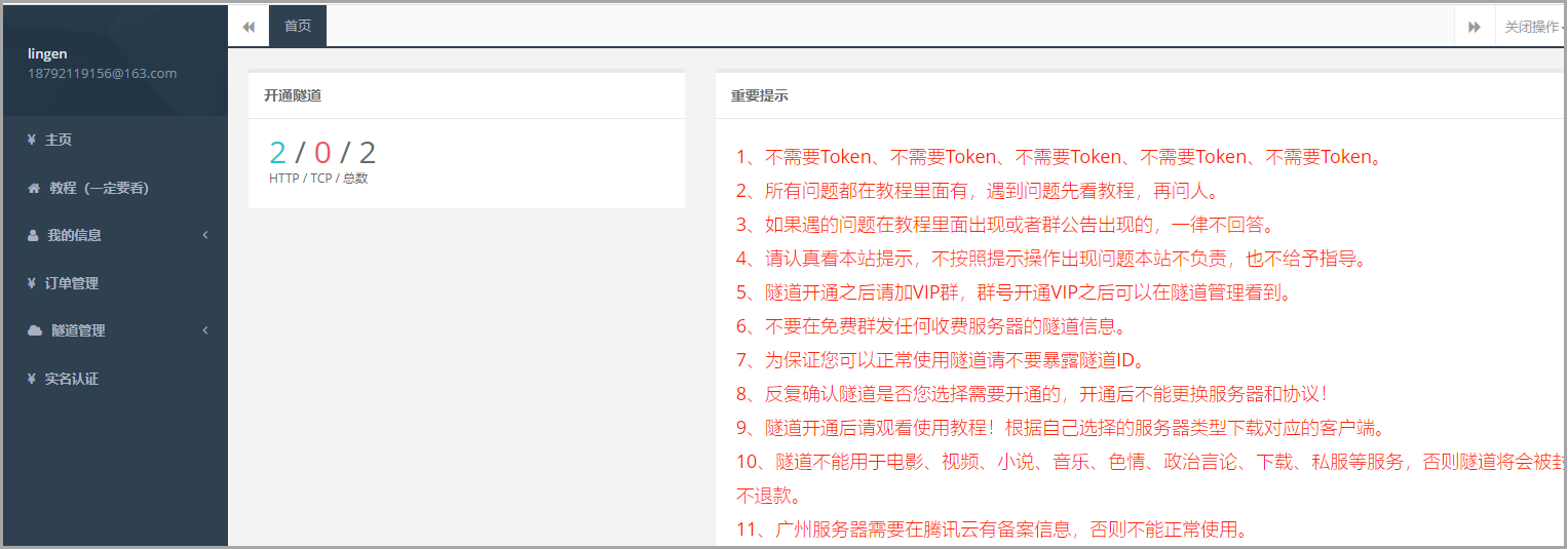 进入ngrok官网(https://www.ngrok.cc/),先注册后登录,登录成功页面如下图2所示。