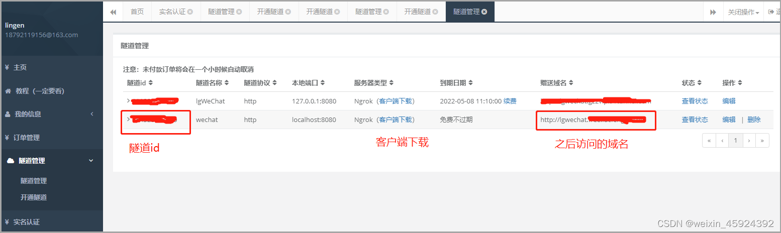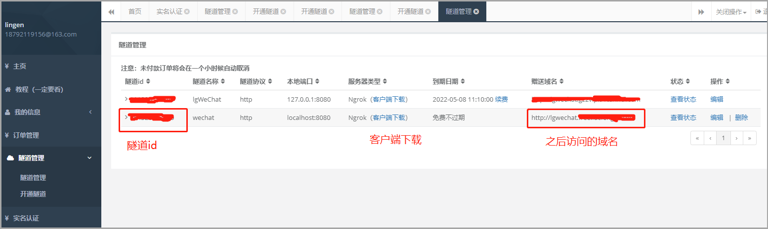 隧道列表显示了该隧道信息,隧道id用于启动服务,增送的域名就是公网访问的域名地址。