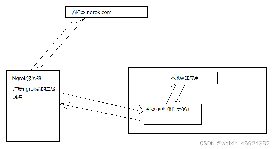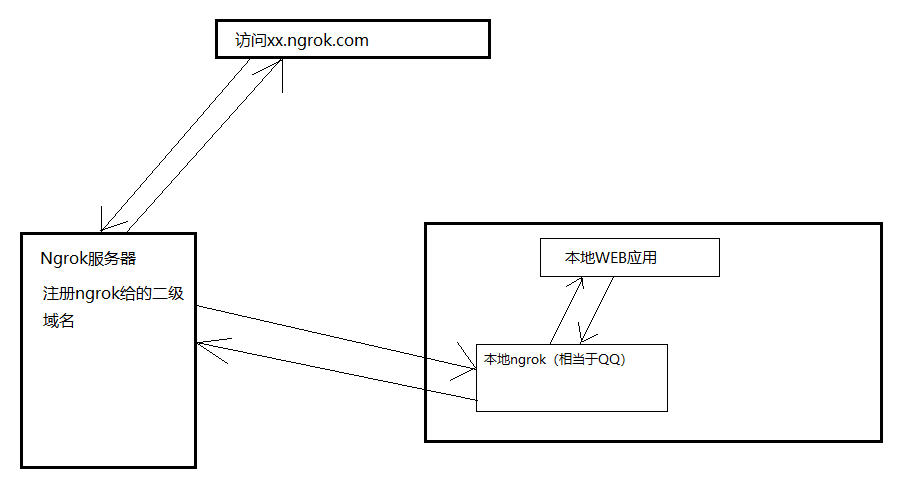 Ngrok服务器与本地ngrok形成一份安全通道,ngrok服务器在外网环境中,这样就可以通过安全通道暴露本地web应用到公网中。