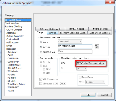 STM32H7是M7内核,双精度浮点,一般使用小端格式,所以我们选择库iar_cortexM7lf_math.a
