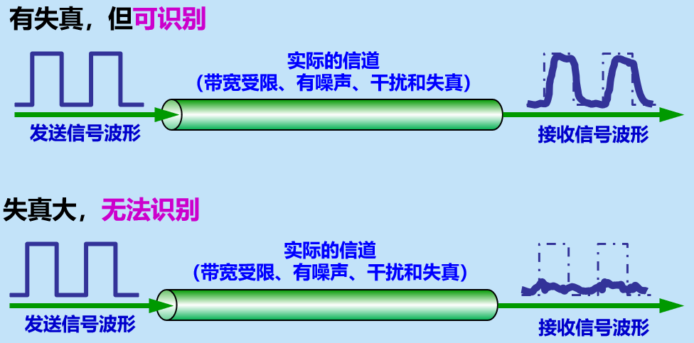 任何信道在传输信号时,会产生各种失真以及带来多种干扰,码元传输的速率越高,或信号传输的距离越远,或传输媒体质量越差,在信道的输出端的波形的失真就越严重