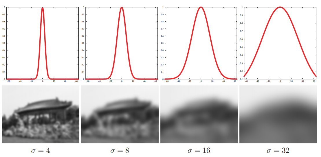 高斯滤波是领域内相邻像素的加权平均,权重值为G(||p-q||),和均值滤波,中值滤波一样,都是将噪声(高频信息)滤除,但是边缘也是高频信号,所以会造成边缘的模糊,边缘信息的丢失,下面为不同的高斯核函数滤波的效果。