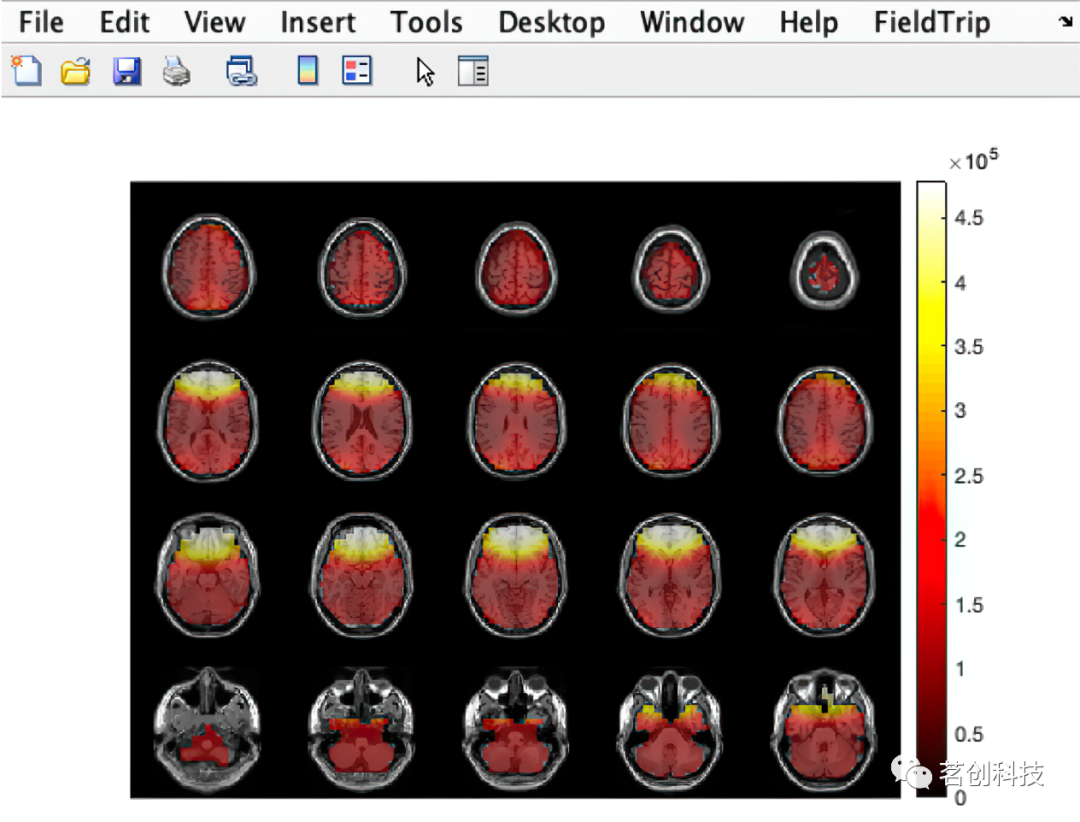 选择感兴趣的潜伏期,就可以将其投射到高分辨率 MRI 中(head image)。下面显示了头模的核磁共振切片的全脑功率。