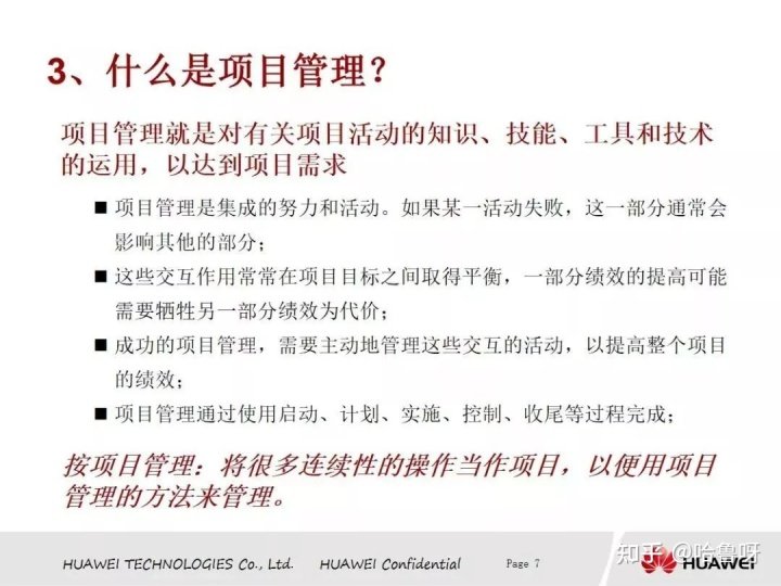 华为的项目管理是一种业务运作模式。华为“以项目为中心”的运作不仅仅是一组实践或工具,更是一套相对完整的管理体系,包括政策、规则、流程、方法和IT工具平台、组织运作和评价等要素。这些要素在项目管理实践中集成应用,并通过一套三层的管控机制,有效开展项目、项目集和项目组合管理,实现商业价值。