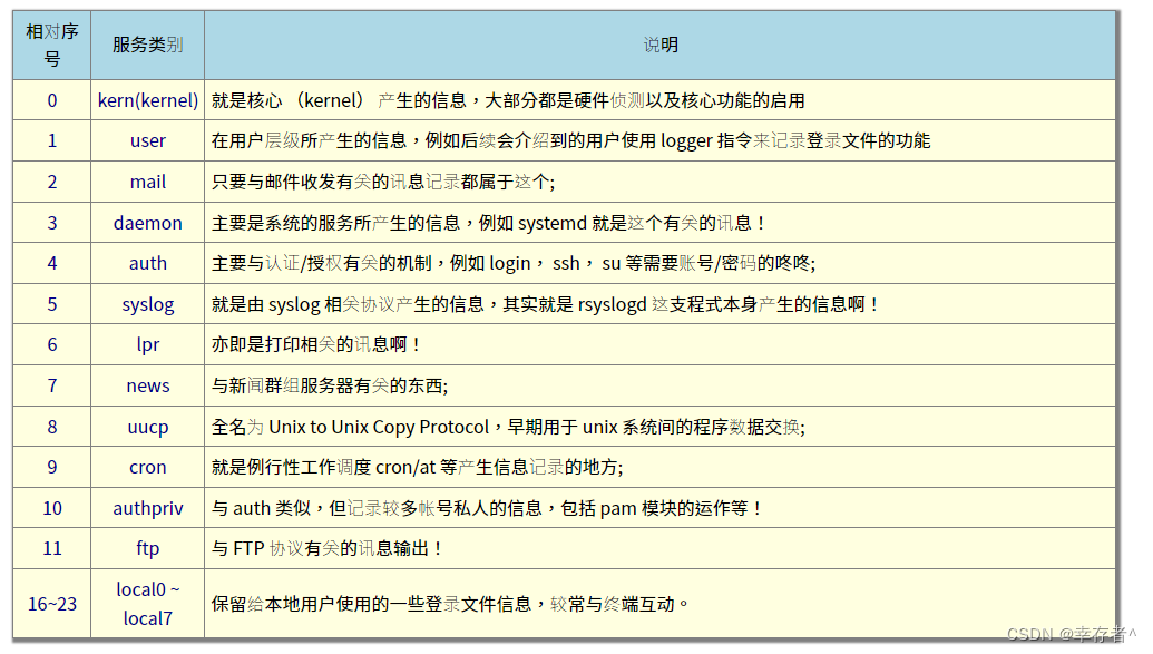SYSLOG_FACILITY=[0-23] :使用syslog.h 规范的服务相对序号来呼叫出正确的资料!