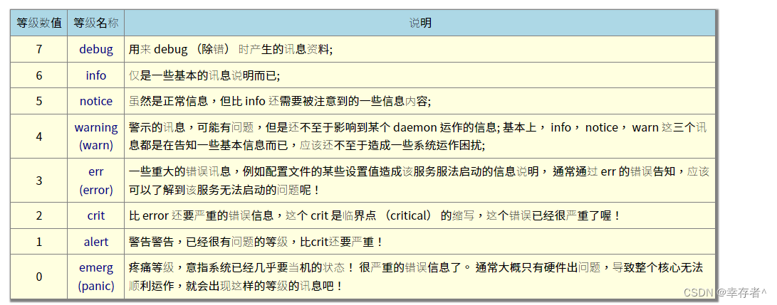 服务名列表.服务名 代表'比后面还要严重的等级 (含该等级) 都被记录下来'的意思,例如: mail.info 代表只要是 mail 的信息,而且该信息技术严重于 info (含 info 本身)时,就会被记录下来的意思。服务名列表.=服务名 代表等级就是此服务的等级