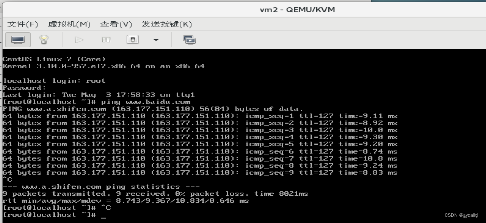 结果:命令行创建的虚拟机可用并且可以ping通外网,如果ping不通记得激活一下网卡