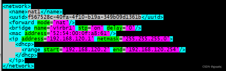 <network><name>nat1</name><uuid>f567528c-40fa-4f10-b19a-349b09d1361b</uuid><forward mode='nat'/><bridge name='virbr1' stp='on' delay='0'/><mac address='52:54:00:0f:a8:61'/><ip address='192.168.120.1' netmask='255.255.255.0'><dhcp><range start='192.168.120.2' end='192.168.120.254'/></dhcp></ip>