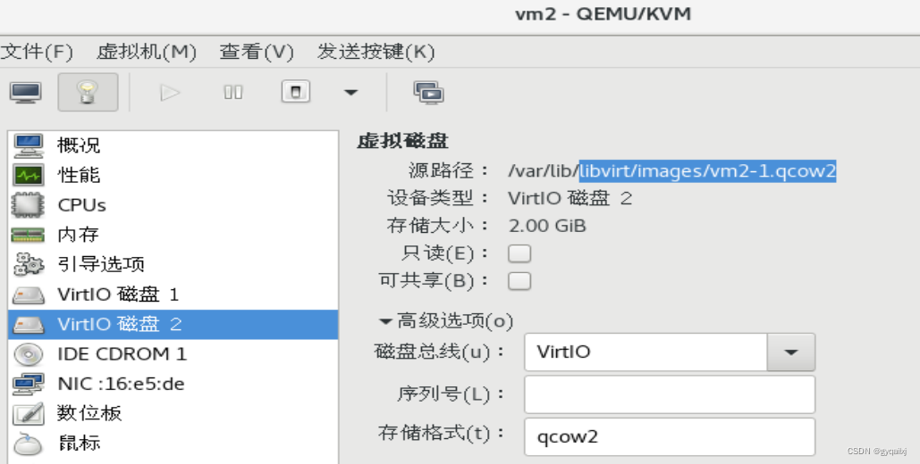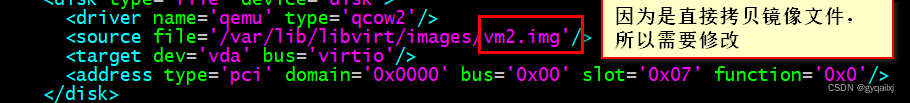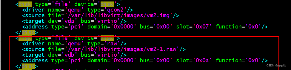 [root@localhost images]# vim /etc/libvirt/qemu/vm2.xml <disk type='file' device='disk'><driver name='qemu' type='qcow2'/><source file='/var/lib/libvirt/images/vm2-1.qcow2'/><target dev='vdb' bus='virtio'/><address type='pci' domain='0x0000' bus='0x00' slot='0x0a' function='0x0'/></disk>