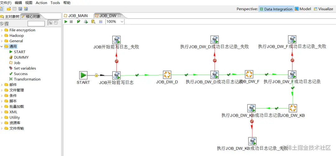 Kettle 中有两种脚本文件,transformation 和 job,transformation 完成针对数据的基础转换,job 则完成整个工作流的控制。