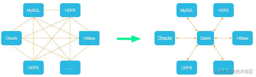 设计理念:为了解决异构数据源同步问题,DataX将复杂的网状的同步链路变成了星型数据链路,DataX作为中间传输载体负责连接各种数据源。当需要接入一个新的数据源的时候,只需要将此数据源对接到DataX,便能跟已有的数据源做到无缝数据同步。