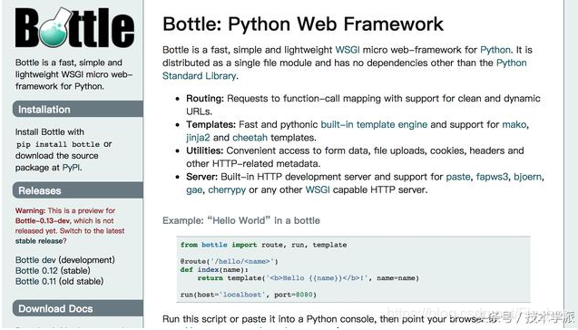 Bottle是一个简单高效的遵循WSGI的微型python Web框架。说微型,是因为它只有一个文件,除Python标准库外,它不依赖于任何第三方模块。