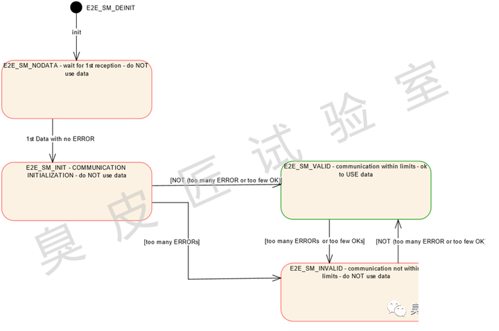 E2E数据的接收是周期性的,接收方在每个周期内,调用对应的profile的检测接口,针对接收到的数据进行检测,验证这个周期内接收到的数据是正确的,并提供额外信息说明检测到的失效形式。下图给出了状态及迁移的说明,从中可以看到数据是否有用是根据窗口期内error数和ok数来做判断。