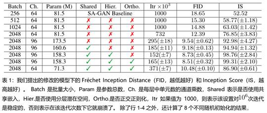 为了产生逼真、精细的图片,我们需要提升GANs的规模。首先我们想到的,就是增大BatchSize以及增大Chanel,以及我们可以不断尝试修改其他的参数和方法,在后文当中会逐一细述。我们先看一下实验结果(表中的各列内容会在后文一一解释):