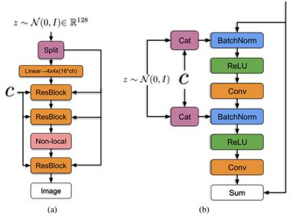 如左图所示将噪声向量 z 通过 split 等分成多块,然后和条件标签 c 连接后一起送入到生成网络的各个层中,对于生成网络的每一个残差块又可以进一步展开为右图的结构。可以看到噪声向量 z 的块和条件标签 c 在残差块下是通过 concat 操作后送入 BatchNorm 层,这种嵌入方式就是共享嵌入,线性投影到每个层的 bias 和 weight。共享嵌入与传统嵌入的差别是,传统嵌入为每个嵌入分别设置一个层,而共享嵌入是将z与c的连接一并传入所有BatchNorm。