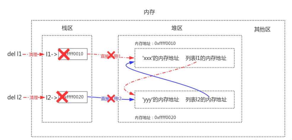 直接引用指的是从栈区出发直接引用到的内存地址,间接引用指的是从栈区出发引用到堆区后再进一步引用到的内存地址,以我们之前的两个列表l1与l2为例画出如下图像