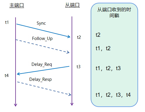 PTP通过在主从设备之间交互同步报文,并记录下报文发送时间,从而计算网络传输延迟和主从设备间时钟的偏差。