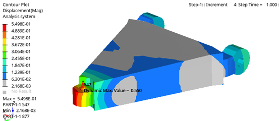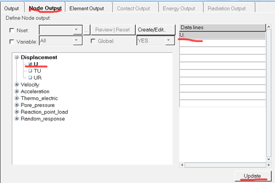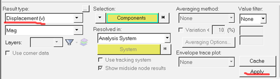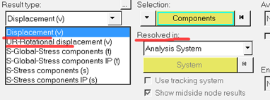 (1)Result Type中带v后缀的表示结果类型为矢量(vector)形式,如位移、速度和加速度等,如结果中的Displacement(v)和UR-Rotational displacement(v),由于是矢量可以选择在分析坐标系或全局坐标下读取。