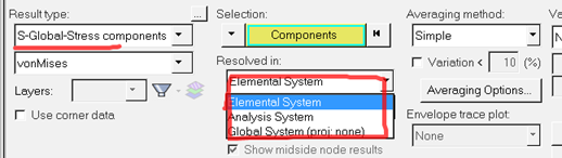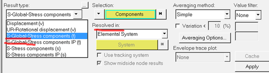 (2)带t后缀的表示结果类型为张量(tensor)形式,如应力张量、应变张量等;张量结果被转换成全局坐标系下,主要是在OBD中使用标量结果和变换矩阵,即结果类型中标有Global的,如S-Global-Stress components(t)和S-Global-Stress components IP(t),该结果可以在单元坐标系、分析坐标系或全局坐标系下读取。