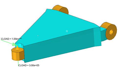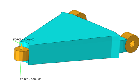 1、分析模型的建立,分析模型包括控制臂及中心连接单元rbe2等,在转向节球铰处受到Fx=1e5N,Fz=3e5N载荷。