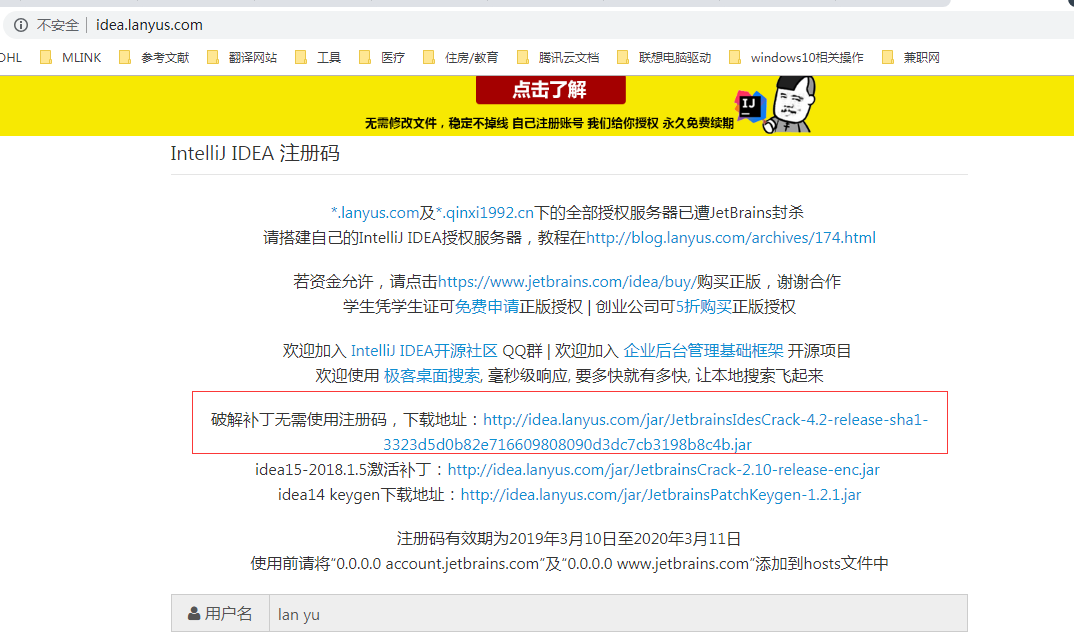 首先我们需要下载破解补丁,直接百度搜索关键词——IntelliJ IDEA 注册码。进入红框处网站后,下载红框标注的补丁文件。
