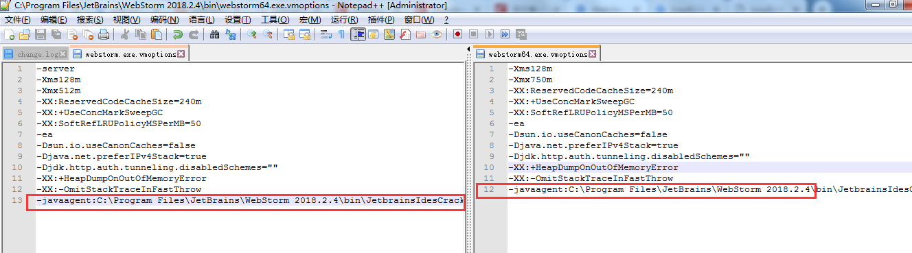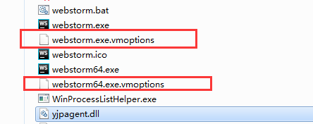 接下来需要修改文件,使用记事本打开bin文件夹下面的WebStorm.exe.vmoptions 和WebStorm64.exe.vmoptions这两个文件。