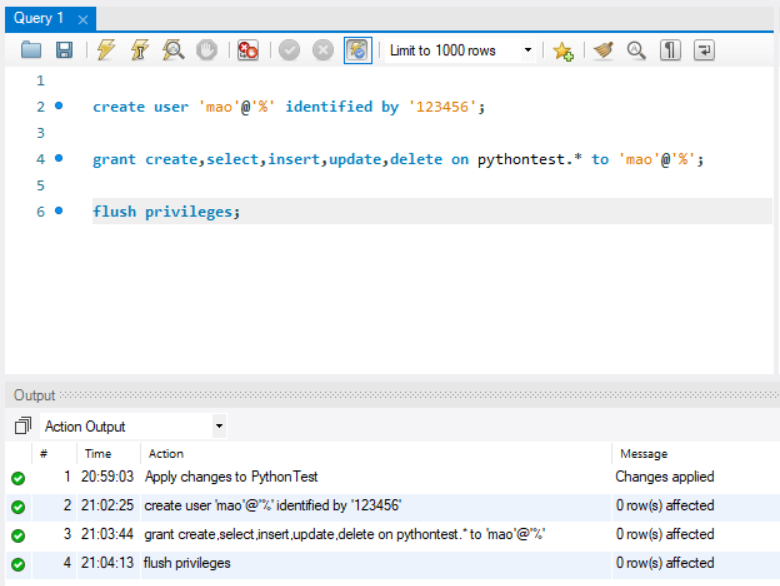 grant create,select,insert,update,delete on pythontest.* to 'mao'@'%';