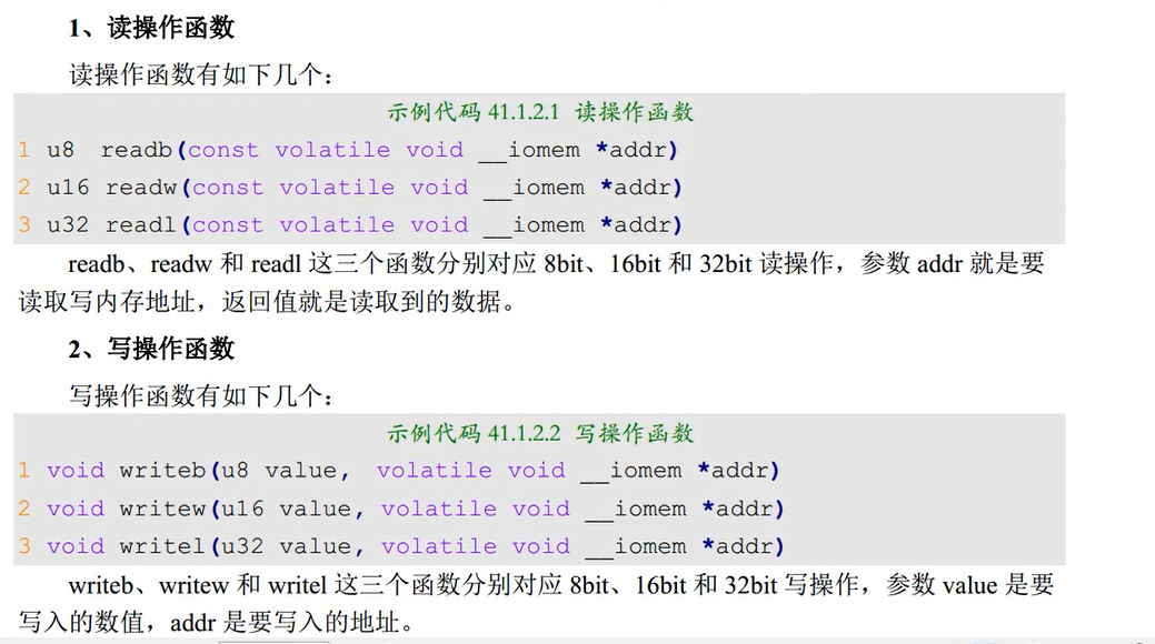 使用ioremap函数将寄存器的物理地址映射到虚拟地址后,我们就可以直接通过指针访问这些地址,但是Linux内核不建议这么做,而是推荐使用一组操作函数来对映射后的内存进行读写操作。