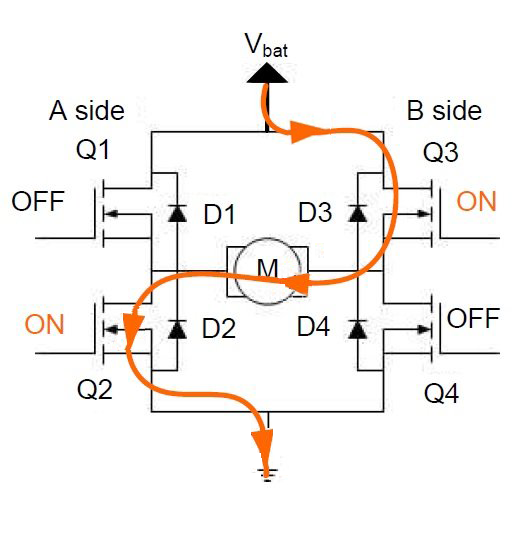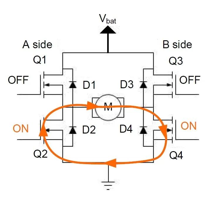 第二种:准备停止的时候,关闭Q1,打开Q2,这时候电流并不会衰减地很快,电流循环在Q2,M,Q4之间流动,通过MOS-FET的内阻将电能消耗掉;