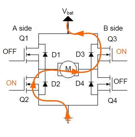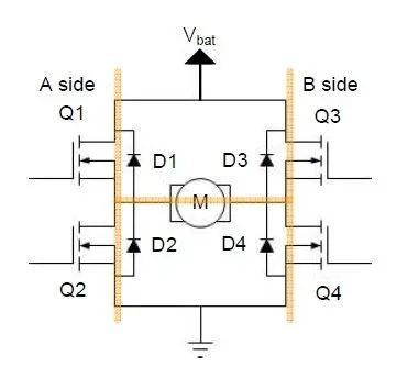 这里有四个开关元器件Q1,Q2,Q3,Q4,另外还有一个直流电机M,D1,D2,D3,D4是MOS-FET的续流二极管;