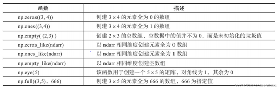 import numpy as np#未初始化的数组 arr1 = np.empty((2,3)) #数组元素以 0 来填充 arr2 = np.zeros((2, 3)) #数组元素以 1 来填充 arr3 = np.ones((2, 3)) #数组以指定的数来进行填充,这里举例3 arr4 = np.full((2, 3), 3) #生成单位,对角线上元素为 1,其他为0 arr5 = np.eye(2) #二维矩阵输出矩阵对角线的元素,一维矩阵形成一个以一维数组为对角线元素的矩阵 arr6 = np.diag(np.array([[1, 2, 3], [4, 5, 6], [7, 8, 9]]))