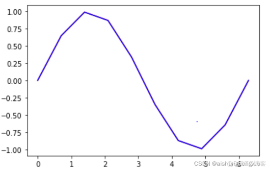 import matplotlib.pyplot as plt import numpy as npx = np.linspace(0, 2 * np.pi, 10) y = np.sin(x)xvals = np.linspace(0, 2 * np.pi, 10000) yinterp = np.interp(xvals, x, y)plt.plot(x, y, 'r-', xvals, yinterp, 'b-') plt.show()