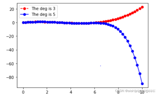 import matplotlib.pyplot as plt import numpy as npx = np.array([0.0, 1.0, 2.0, 3.0, 4.0, 5.0]) y = np.array([0.0, 0.8, 0.9, 0.1, -0.8, -1.0]) #得到多项式的系数 z = np.polyfit(x, y, 3) z2 = np.polyfit(x, y, 5) #得到多项式函数 f = np.poly1d(z) f2 = np.poly1d(z2) #用两个函数进行拟合 xval = np.linspace(0, 10, 50) yval1 = f(xval) yval2 = f2(xval) #作图 plt.plot(xval, yval1, 'r--o', xval, yval2, 'b-o') plt.legend(['The deg is 3', 'The deg is 5']) plt.show()print(f) # out : 0.08704 x^3 - 0.8135 x^2 + 1.693 x - 0.03968 print(f2) # out : -0.008333 x^5 + 0.125 x^4 - 0.575 x^3 + 0.625 x^2 + 0.6333 x - 1.74e-14