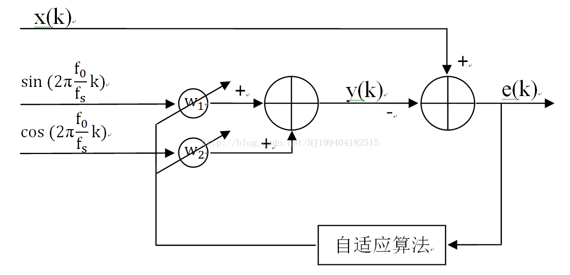 当我们知道原始信号里的干扰信号频率是多少时(例如最常见的50Hz工频干扰),这时我们只需要知道这个干扰信号的相位和幅度,然后就可以完全的“再现”这个干扰信号,然后我们就可以直接的从原始信号中将其减去,从而就得到了我们想要的信号成分。这一过程实际上就是自适应陷波器的基本工作原理。关于自适应实现算法的具体原理可以参考博主之前写过的博客文章《浅谈自适应滤波器》,下面给出的是今天要介绍的自适应陷波器的结构图: