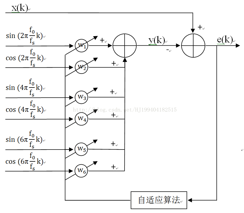 其中x(k)是带有特定频率干扰的信号,也即输入的原始信号,可见它是从自适应滤波器的期望信号端输入的;而sin(2π f0/fs k)和cos(2π f0/fs k),是我们已知的频率为f0的干扰信号(其中fs是采样率),将它们分别乘以W1和W2进行适当的线性组合,就可以使其输出y(k)接近实际的干扰,最后输出的误差e(k)就是我们感兴趣的信号。如何进行W1和W2的选择这其实是自适应算法需要完成的工作,具体来说就是采用某种准则来构建一个关于误差e(k)的函数,通过是误差e(k)最小化来求得W1和W2,最常用的准则就是使误差的均方和最小。这也是本次博主要和大家分享的具体的自适应陷波器。