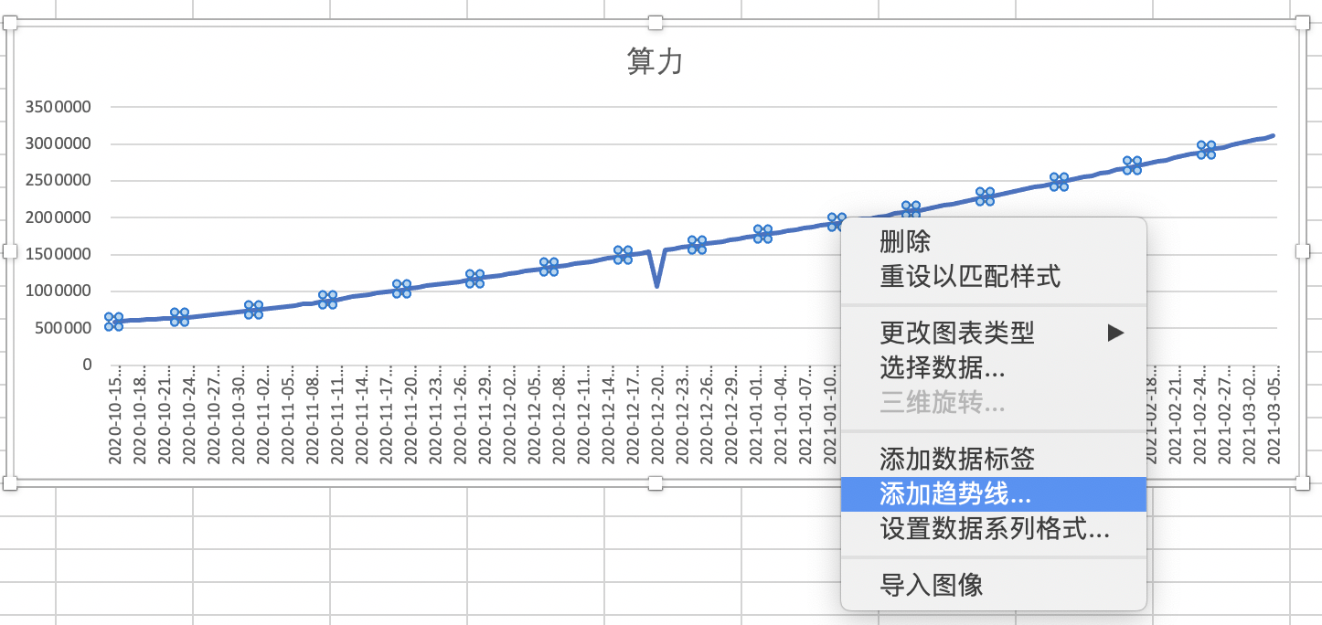 选择数据列,日期、算力,点击菜单栏“插入-折线图”