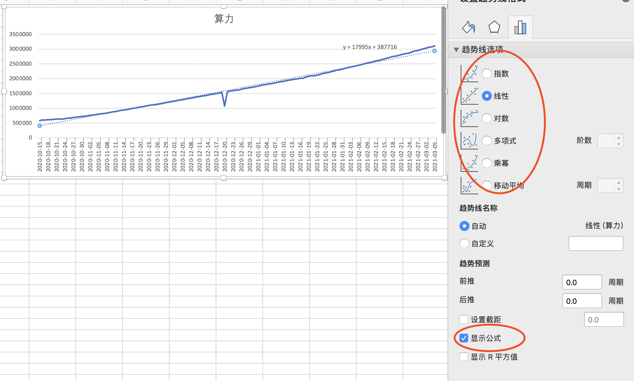 点击后,会在折线图上展示一条虚线趋势线,并在右侧自动打开趋势线选项。可以选择不同的函数趋势线。在下方选中“显示公式”,即可展示公式了。