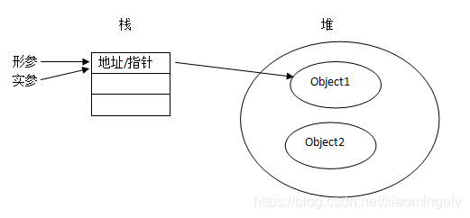 事实上,由于对引用对象的地址复制,形参和实参之间还是存在关联的,地址指向了同一个对象,也就是说我们调用testObj操作形参时,对应操作的对象也是实参。但是调用testObject时,就是另一种状况了,当我们直接将形参替换成另一个值,在内存中会形成下图的情况
