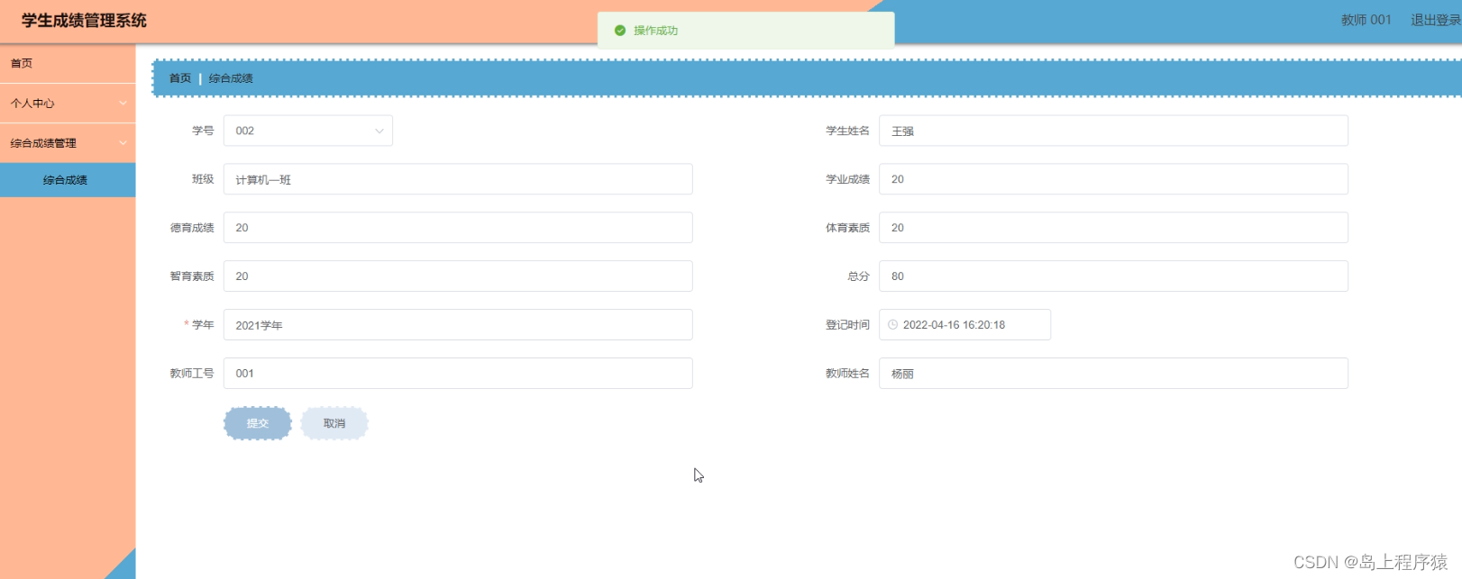 任何系统都要遵循系统设计的基本流程,本系统也不例外,同样需要经过市场调研,需求分析,概要设计,详细设计,编码,测试这些步骤,基于java语言设计并实现了学生成绩管理系统。该系统基于B/S即所谓浏览器/服务器模式,应用java技术,选择MySQL作为后台数据库。系统主要包括首页、个人中心、学生管理、教师管理、班级管理、综合成绩管理、专业管理、课程信息管理等功能模块。